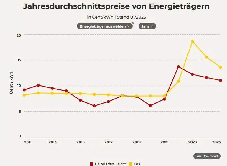 Grafik: Endkundenpreise Heizöl und Gas, Quelle: Pro Pellets Austria www.propellets.at